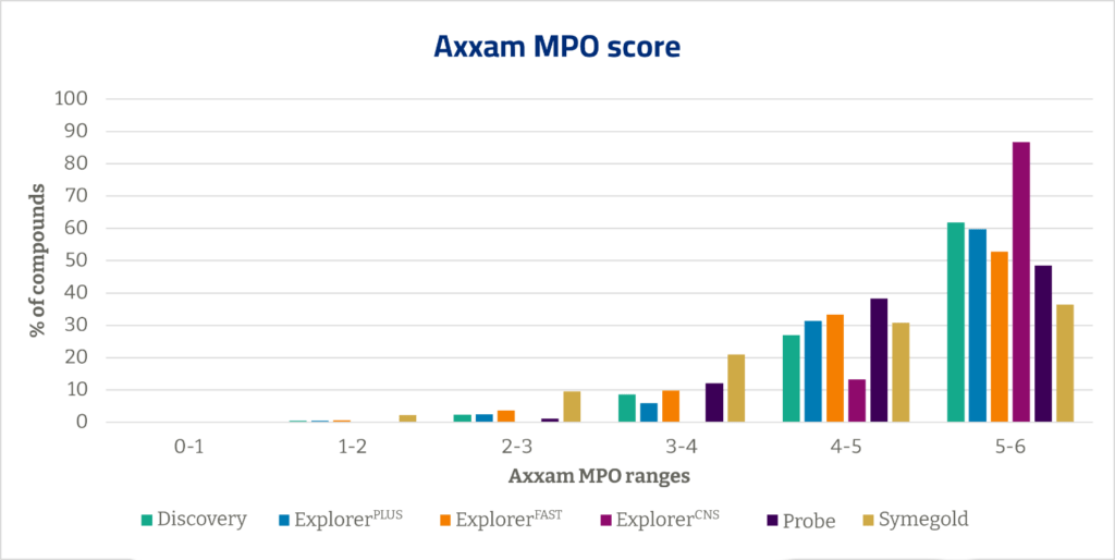 AXXDiversity and Symegold are complementary, high-quality compound collections specifically curated for screening purposes, with no overlap between the two. Both libraries are designed to offer flexibility and high impact for high-throughput screening projects.